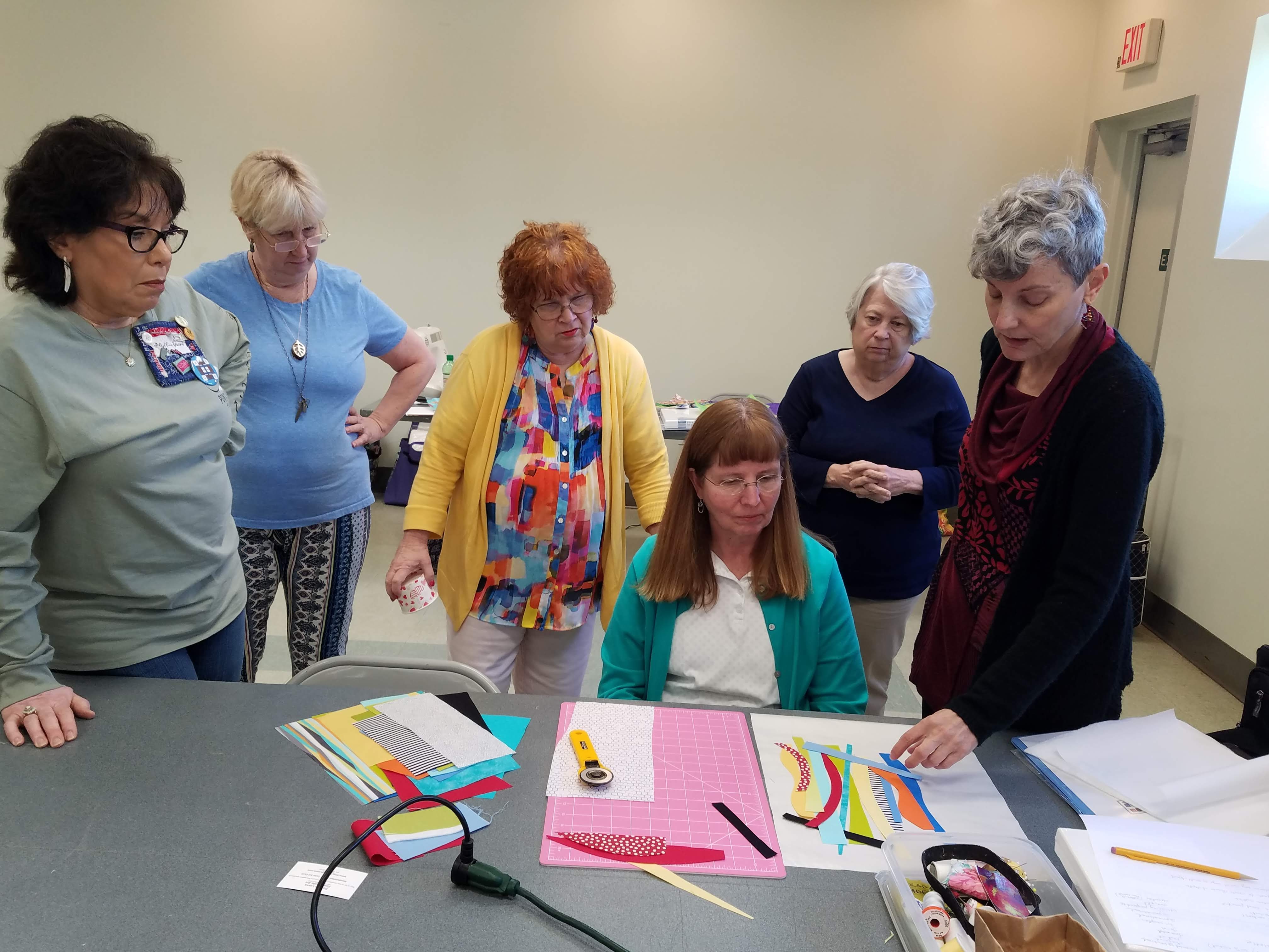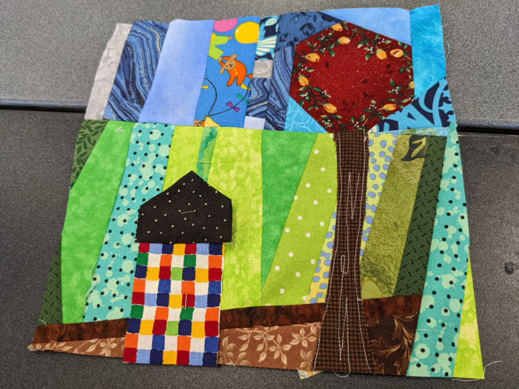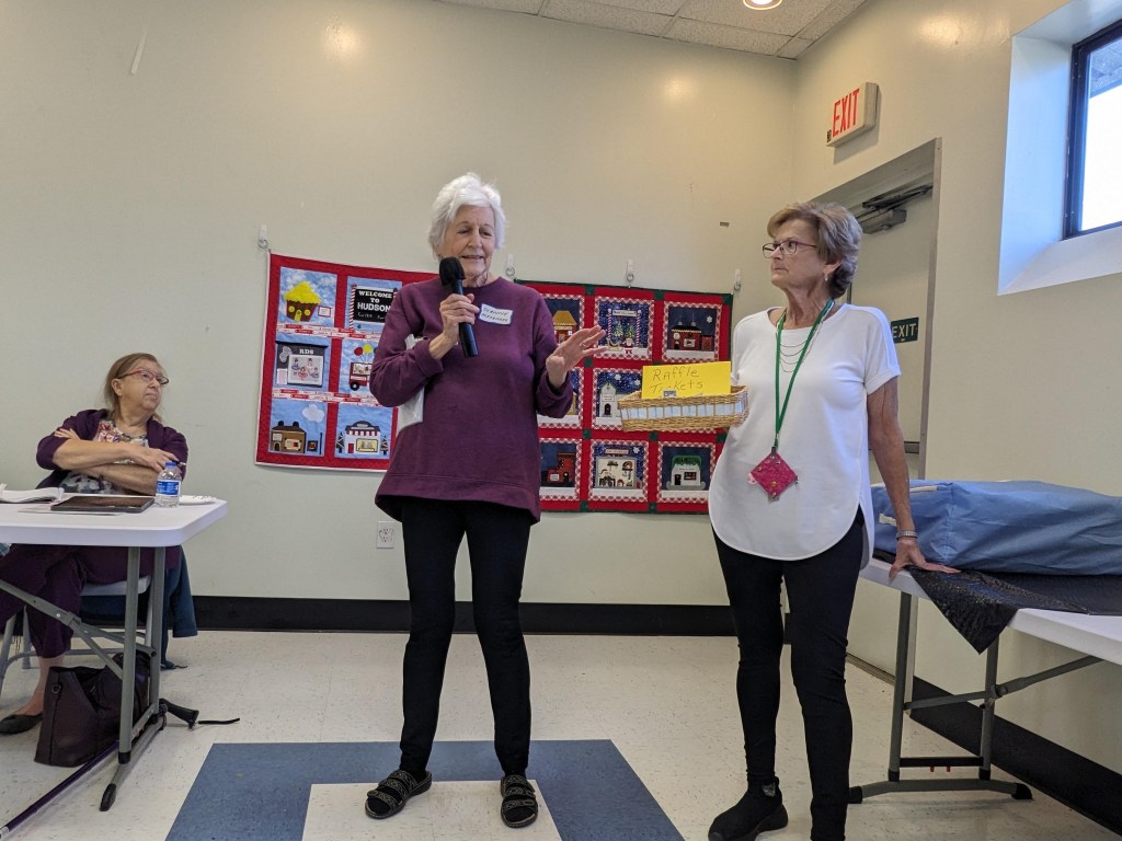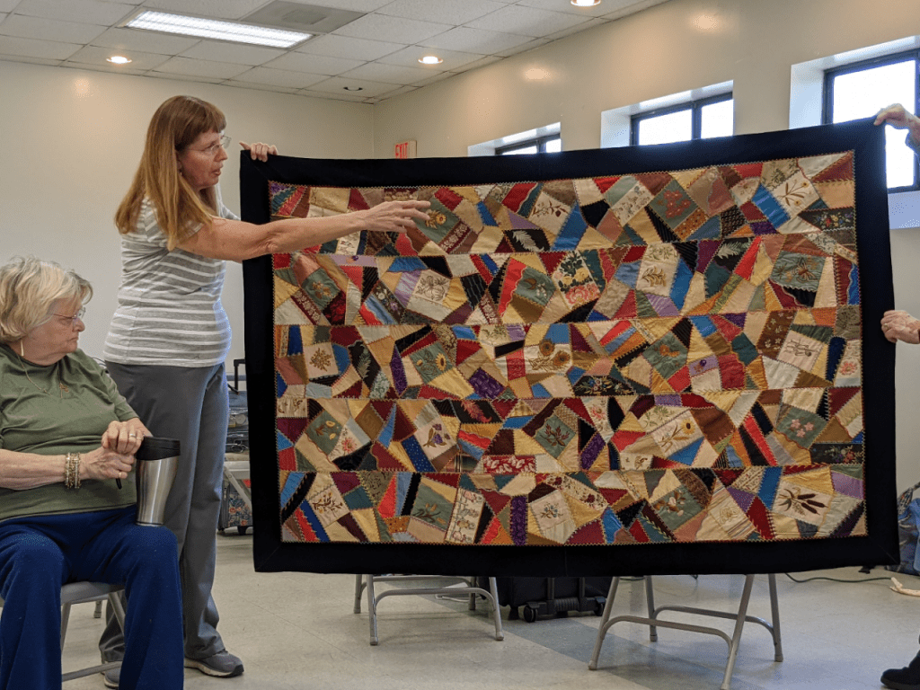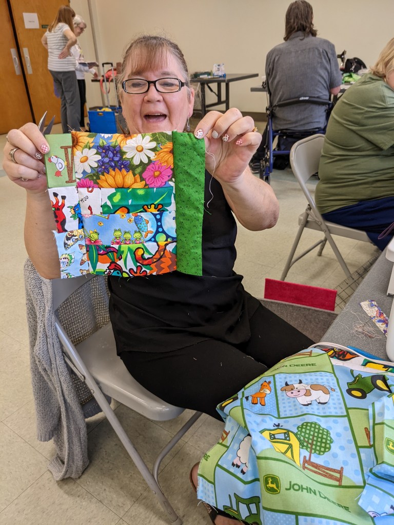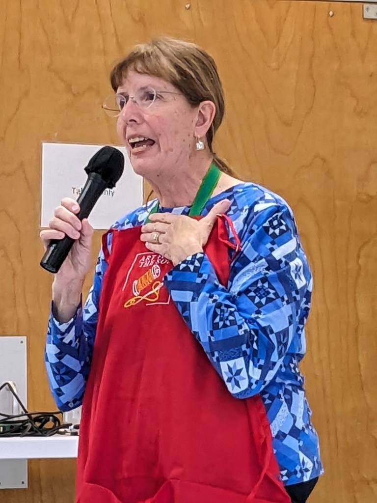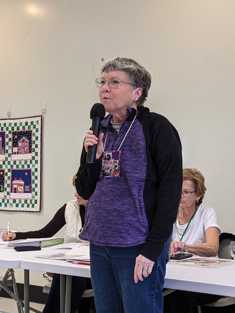 - The “Artsy Challenge” for the 2025 Quilt Show was kicked off at the Artsy Group’s meeting this month. Each participant drew random criteria from brown paper bags to specify items in 7 different categories! It’s called the “Recipe Challenge” and it’s not too late to be included. Categories include color, block, quilting style, fabric type, and Connie’s favorite: the ZINGER. If interested, see Stephanie S for your “ingredients.” Plan to have your challenge project ready to share at the Artsy meeting this coming September.