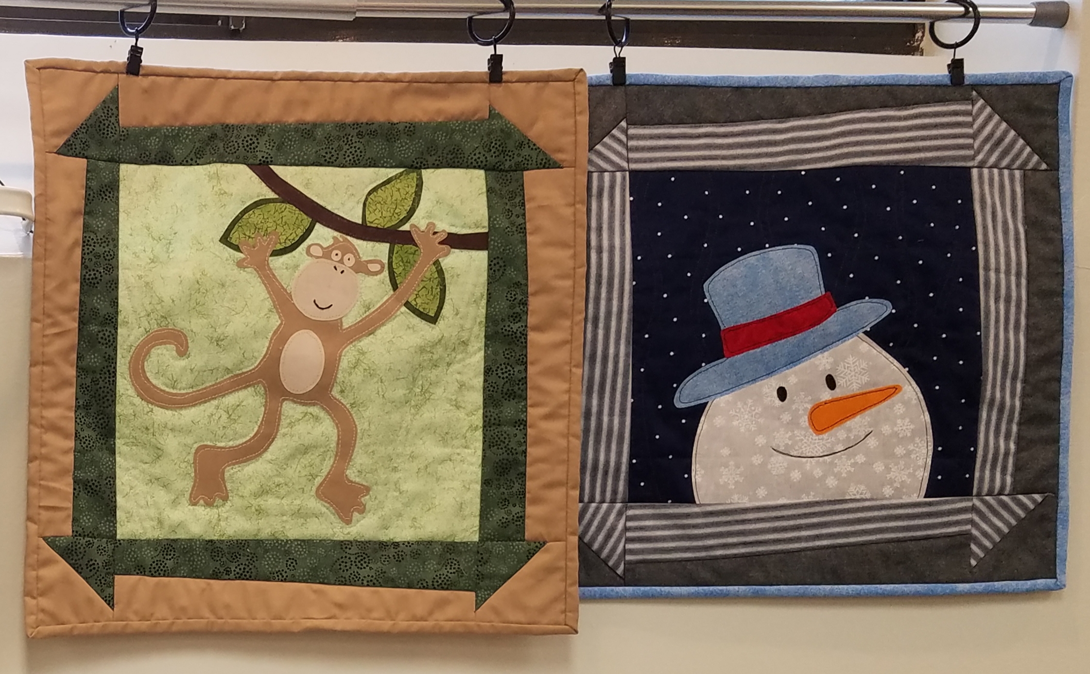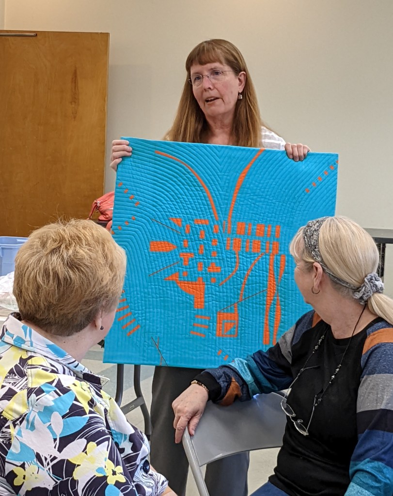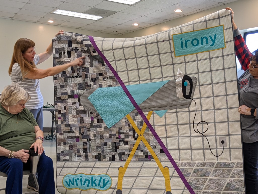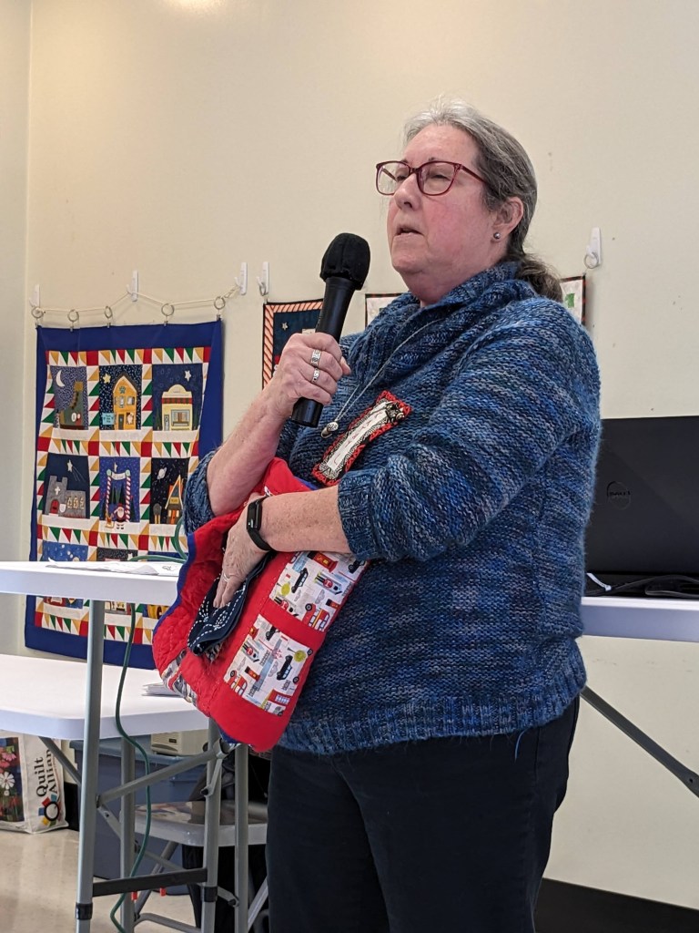 Janis H shared some interesting projects she had made and recently re-discovered during her unpacking into a newly-renovated house. Also, as you can see on the far wall, we had a chance to view “up close” all the wonderful details included in the 2023 BOM series Connie called “Christmas Village Play Time.” These quilts had been showed in December, but today we got to really appreciate the creativity of these quilters who brought theirs back to be hung: (from left to right) – Connie G, Maria W, Ginny C, Susan H, and Carolyn F. Thanks for sharing!