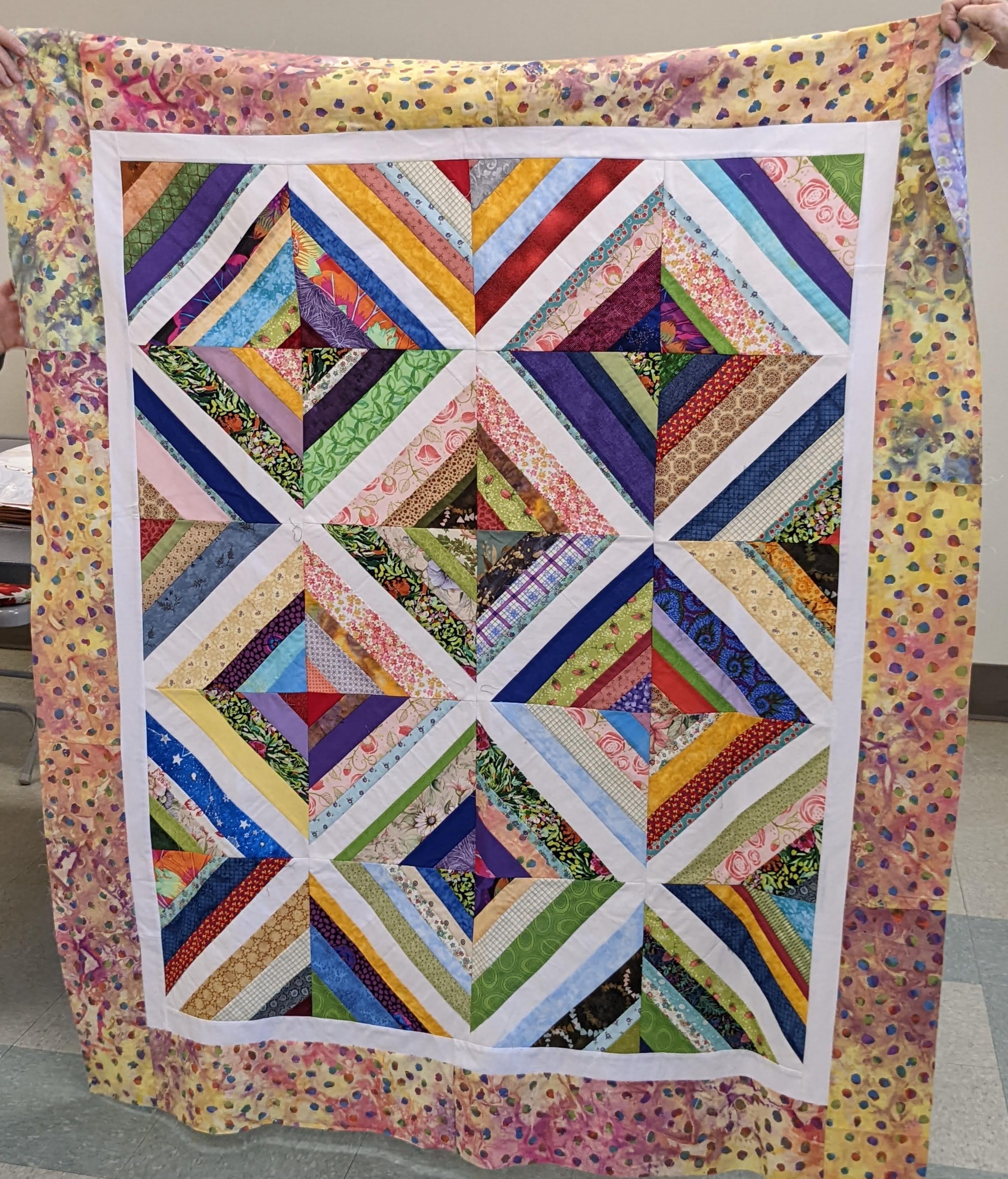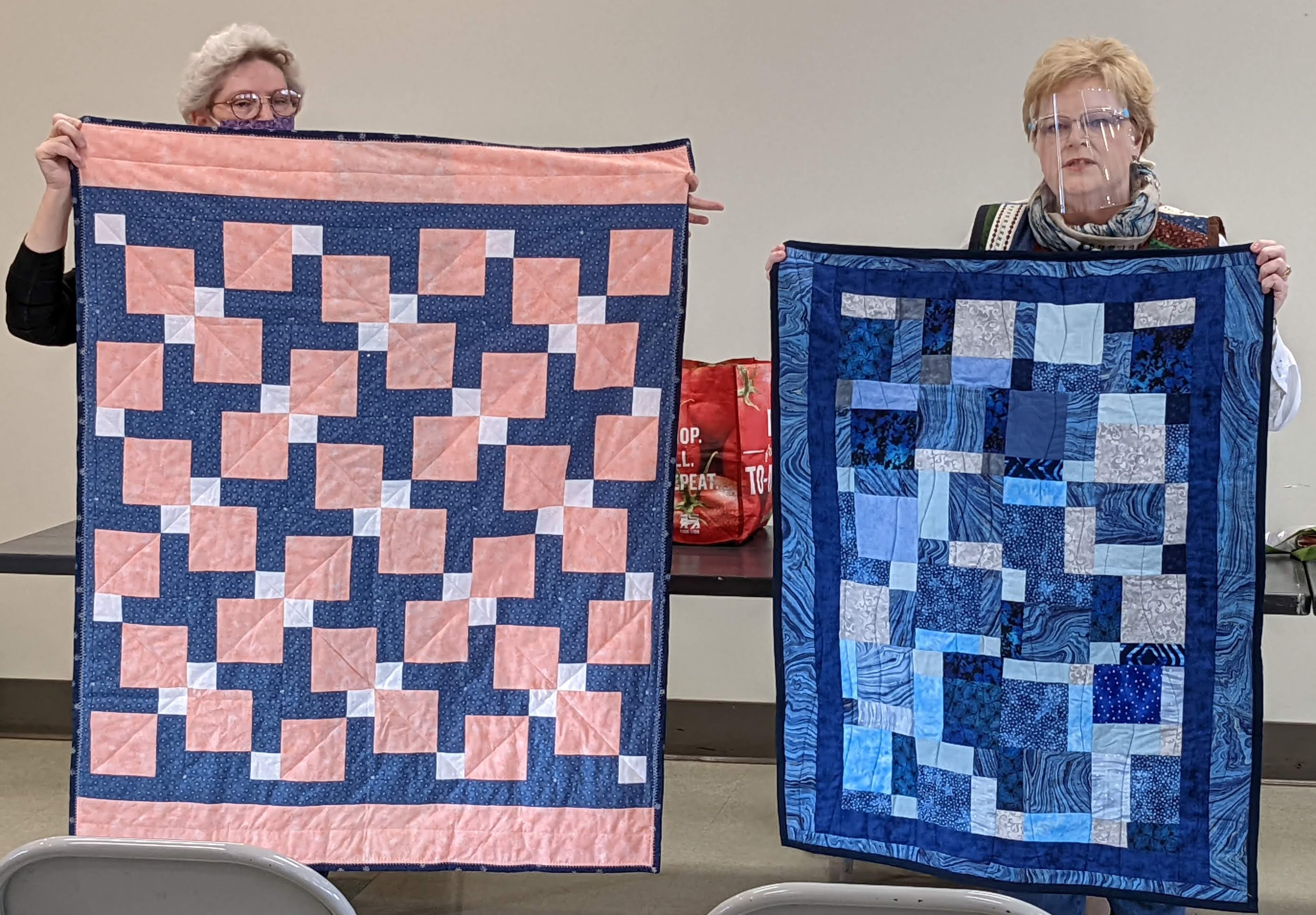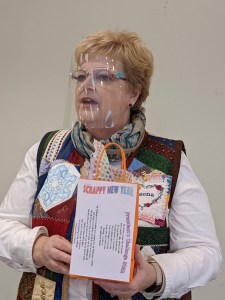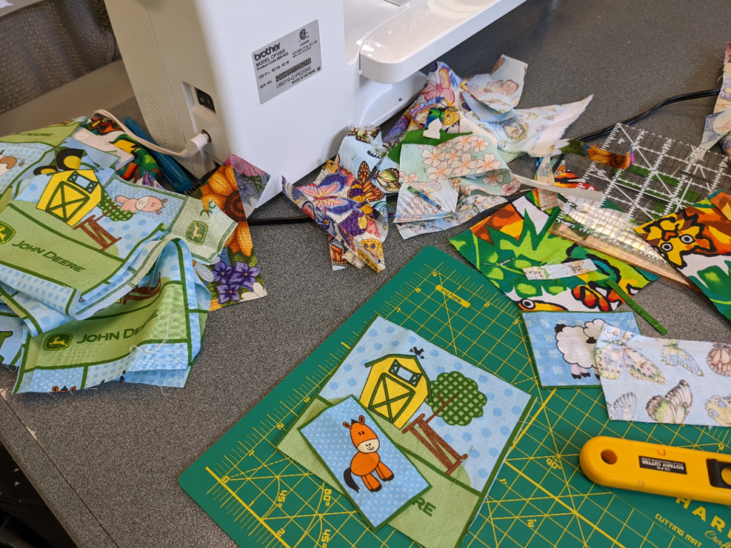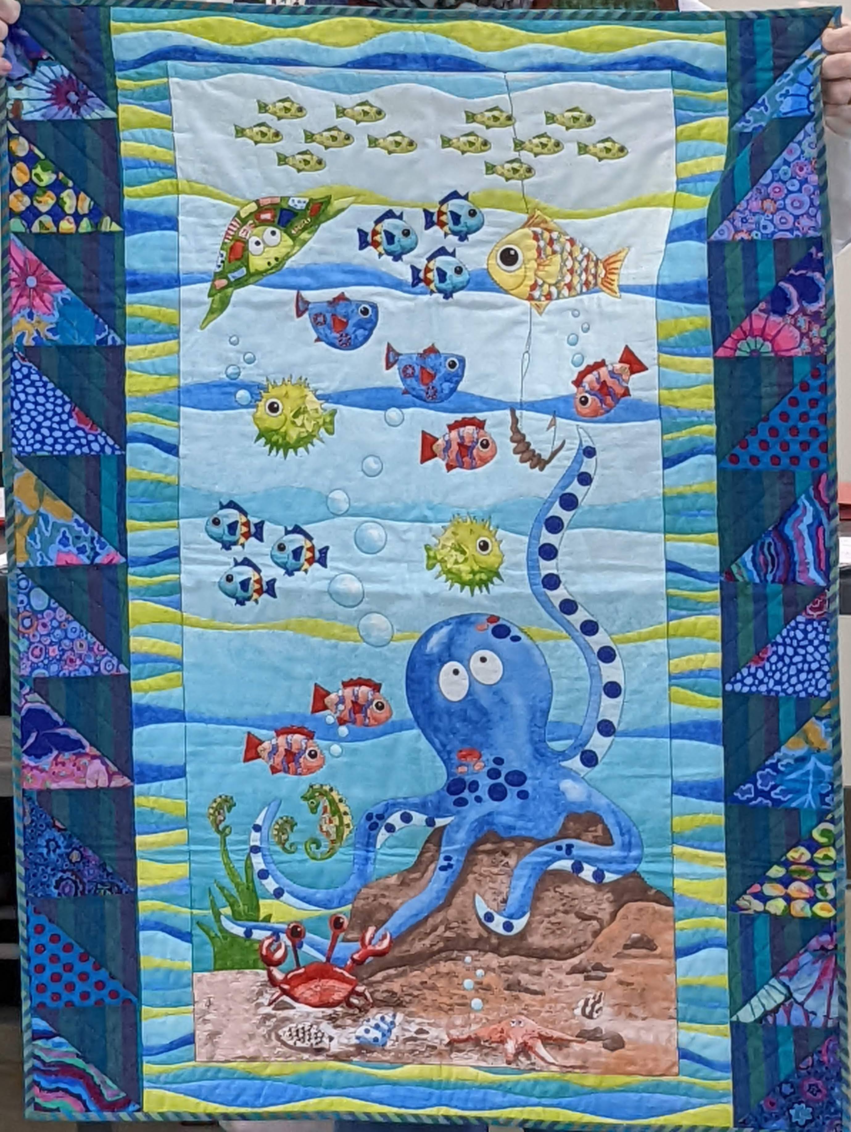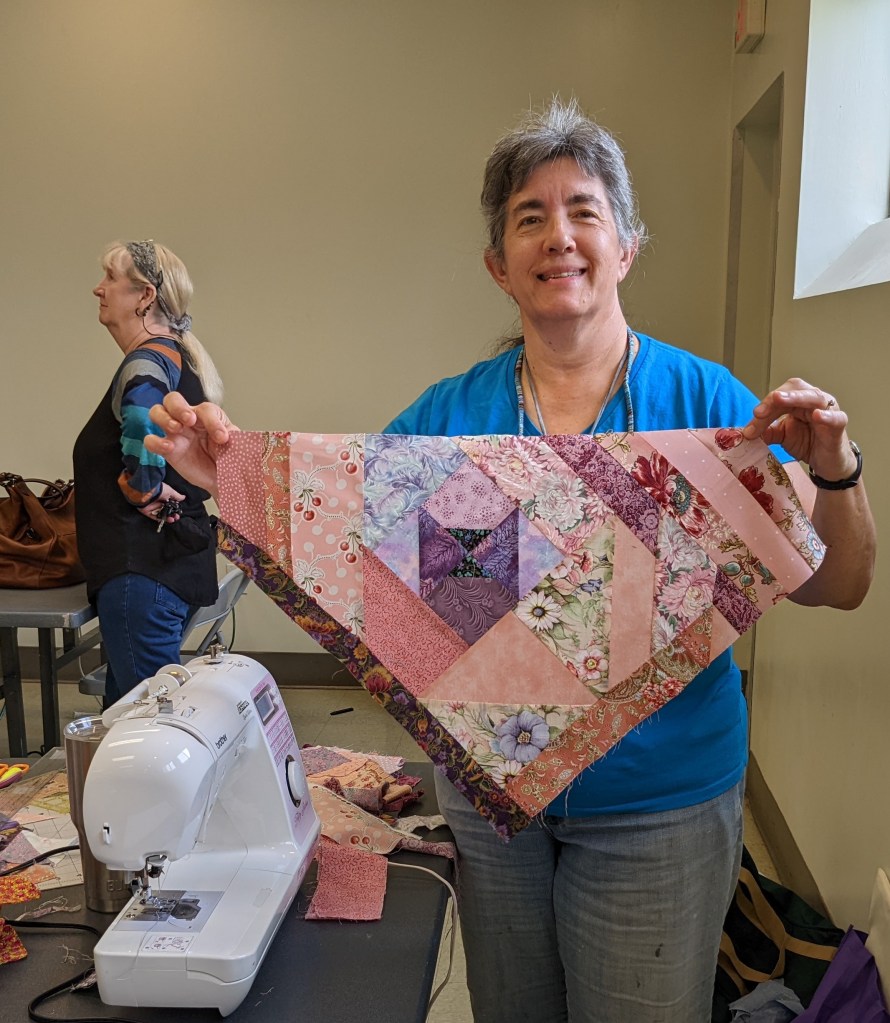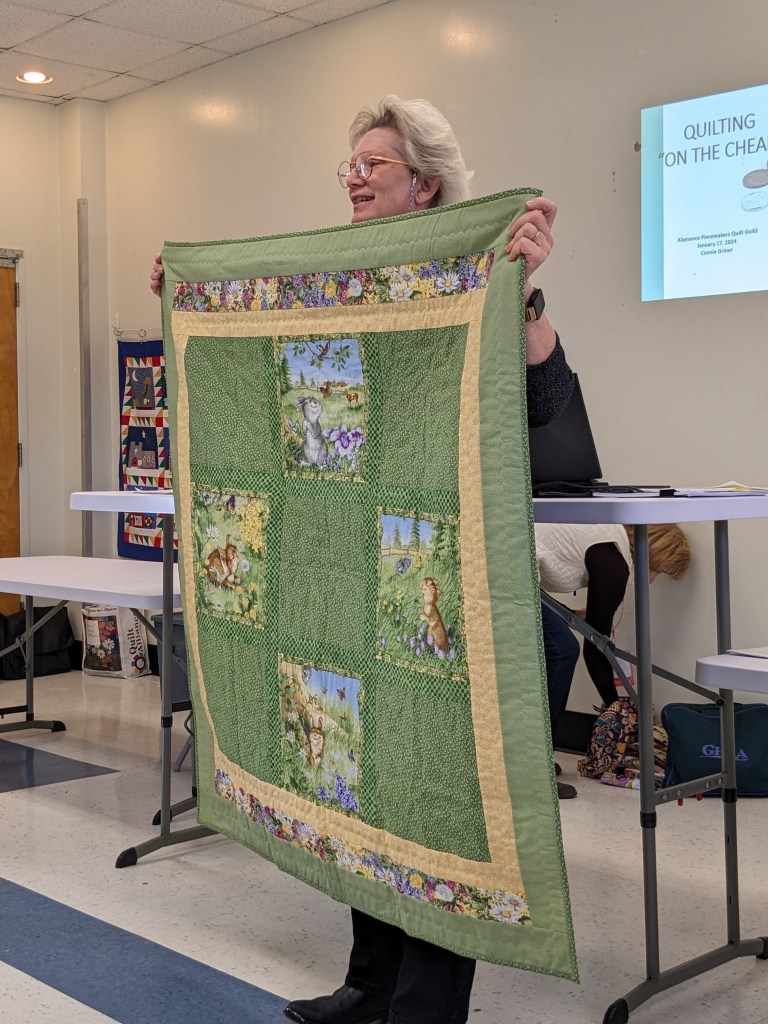 Members get to share their completed quilts at most every meeting. Today we met a new-ish member, Kathy L, and heard about her recent quilting cruise! Another quilt (of many shared today) was made by Joanna I for her grand-niece, using fabric that she had picked up from the Free Material Table at a guild meeting! Lovely!