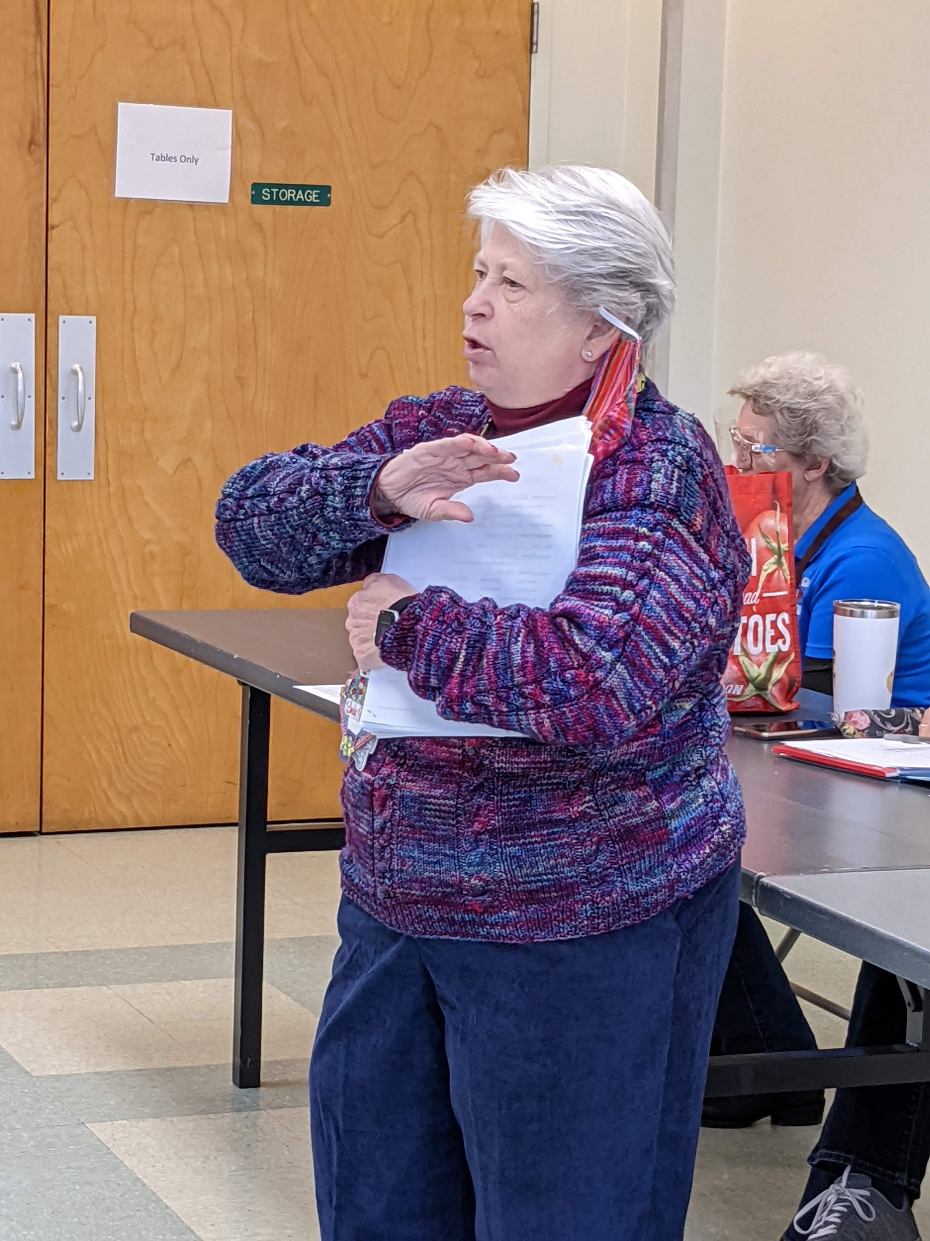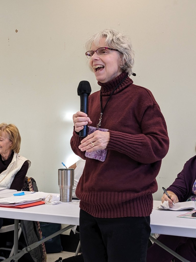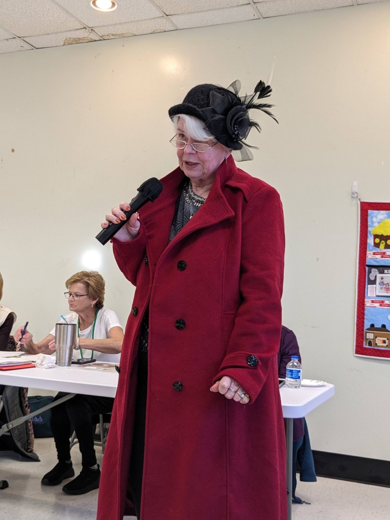 Deborah F, our President for 2024, began her comments by sharing her goal of “Inclusion.” If you know Deborah, you know that she wants to know about it if you have a concern or unmet need. She then opened the business meeting by suggesting a few changes and making a few requests of our members. Requests include – letting her know if you are holding any inventory belonging to the guild, and who has keys to Elmira and the storage cabinets there. She also suggested (and members approved her idea) that Guild members provide “In Case of Emergency” information. It will be protected by a signature-seal and lock, but available “just in case” it is needed.