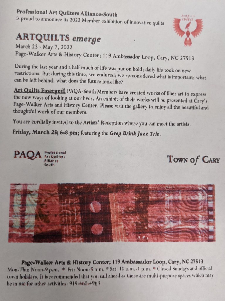 - March 8 (Friday night of the quilt show at 6 PM) – Hollis Chatelain will speak on “The Emotion of Color.” Free to guild members. At Elon Community Church.