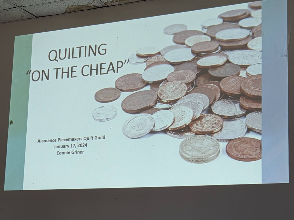 You may have heard the adage, “Use it up, wear it out, make it do, or do without” – which Connie credited to http://www.seasonedhomemaker.com. In her presentation today, Connie contrasted that mindset from “the old days” with her definition of “Quilting on the cheap.”