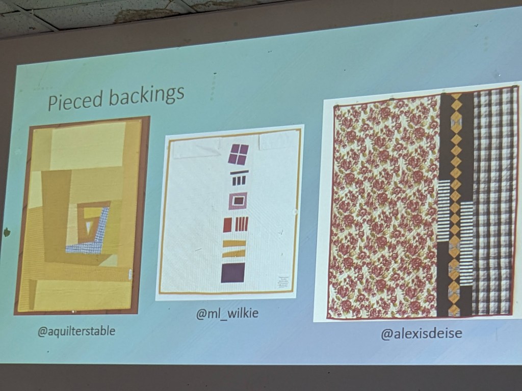 - Connie’s notes and suggestions were extensive! (If she shares her notes, I’ll archive and link it here.) She started by sharing a photo of her own fabric stash – Very Impressive! From talking about Fabrics, she moved to Patterns, then Batting, Thread, Backing, Classes, Sewing Machines, Quilting options, and even covered Irons!
