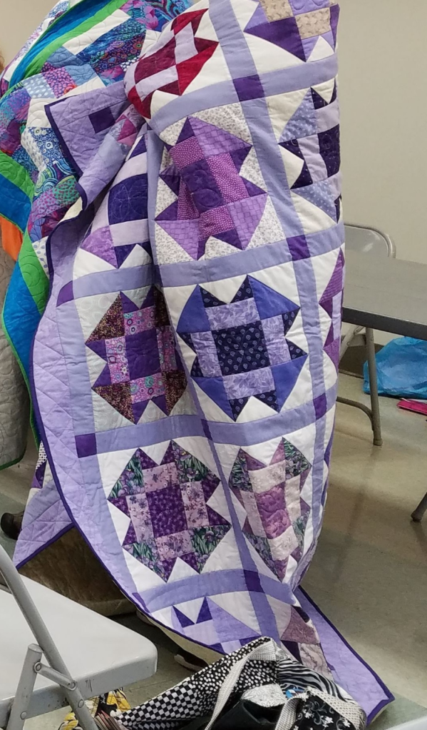 Members were given a new block pattern to try each month, and asked to bring their finished block back to the next month’s meeting. Some guild members contributed more than one block each month! At the end of the block-making effort, similar blocks were assembled together into a quilt top. The guild provided batting and subsidized the cost of having the 6 completed tops quilted.