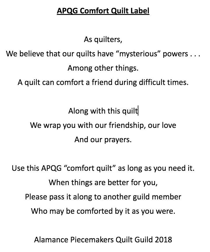 Here is a story written by one of our members in 2018 about the very first Comfort Quilt used by Alamance Piecemakers Guild (made in the early 1990’s, now retired). The story describes exactly what a “comfort quilt” is and why it is so special.