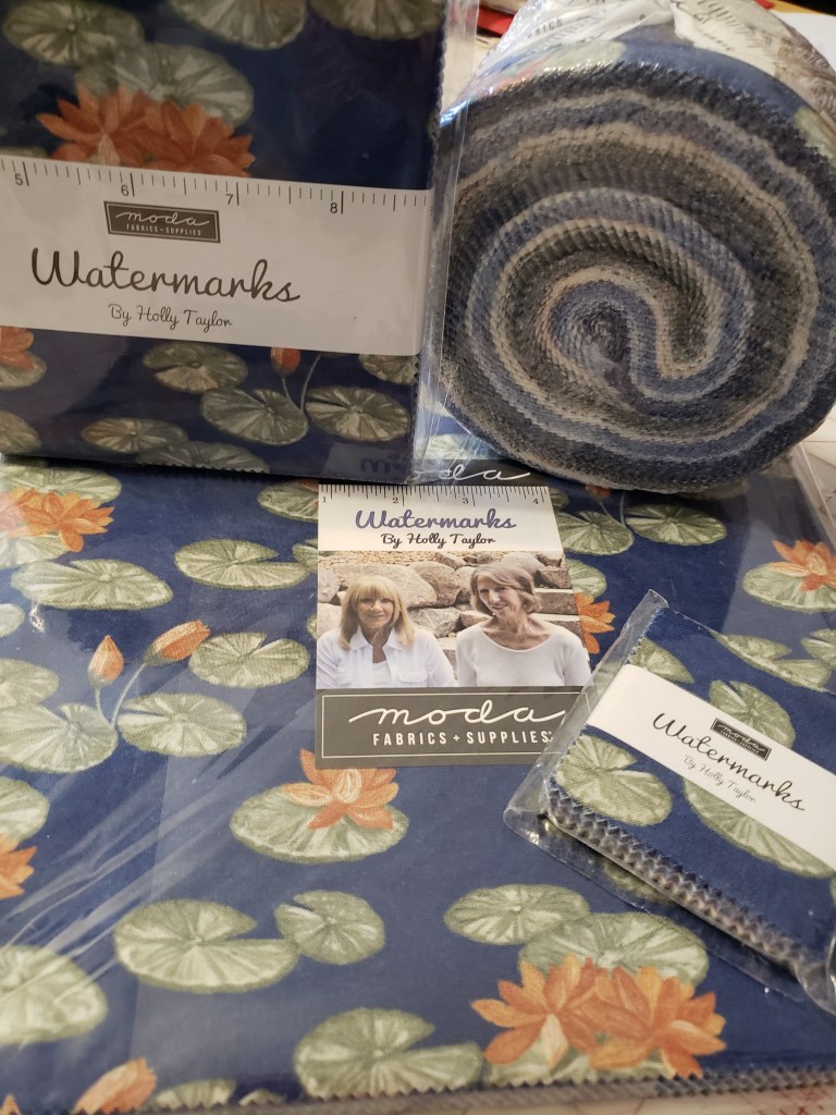 - PLUS a Moda fabric pack donated by Debi Radcliff consisting of a layer cake, jelly roll, charm pack, and a mini-charm pack from the line “Watermarks” by Holly Taylor (pictured below).